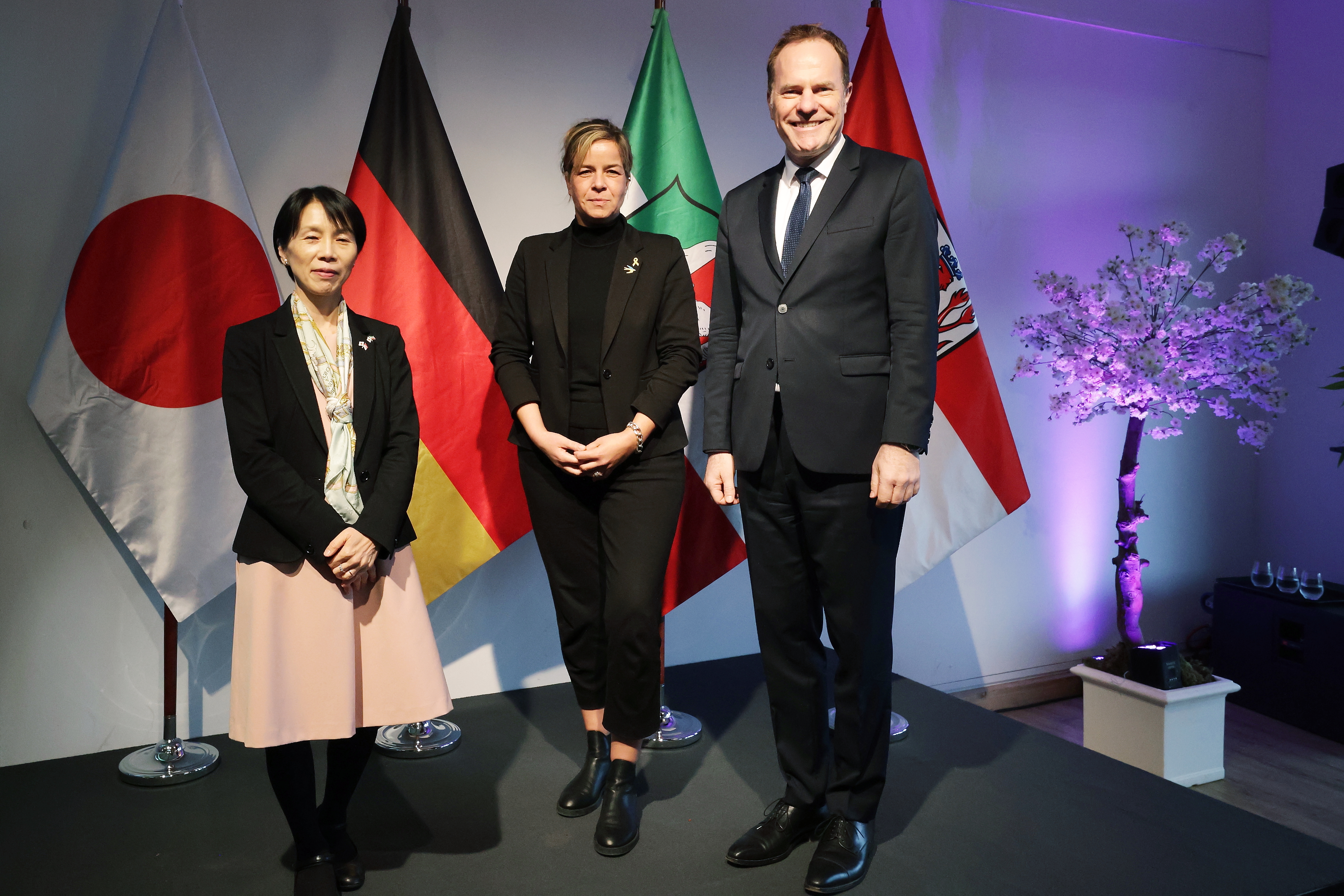 Bildunterschrift v.l.n.r.: Setsuko Kawahara, japanische Generalkonsulin in Düsseldorf; Mona Neubaur, Ministerin für Wirtschaft, Industrie, Klimaschutz und Energie des Landes Nordrhein‑Westfalen; Dr. Stephan Keller, Oberbürgermeister der Landeshauptstadt Düsseldorf. © Landeshauptstadt Düsseldorf/David Young