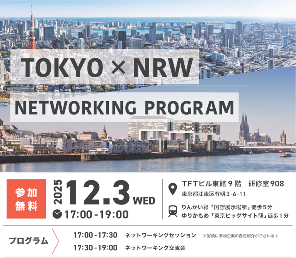 NRW州の企業・機関と直接話し、ヨーロッパ市場参入や技術協力の糸口をつかむ貴重なチャンス。ドイツ企業との協業や新たなビジネス展開を目指す皆様の参加をお待ちしている。定員に達し次第締め切りとなるため、ぜひお早めの申し込みを。