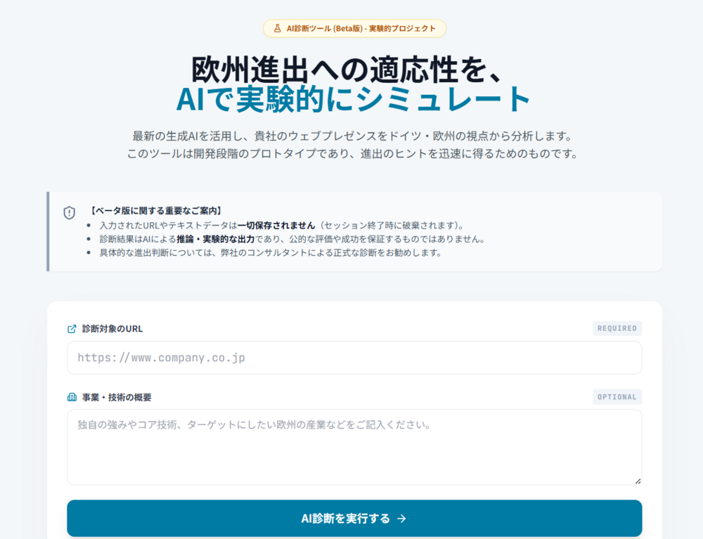 今回、NRW.Global Business Japanが公開したWebサイトチェックツール(ベータ版)は、URLを入力するだけで、欧州基準の観点から自社サイトの対応状況を簡易的に確認できる仕組み。専門的な知識がなくても利用しやすく、欧州進出を検討中の企業のみならず、すでに欧州で事業を展開している企業にとっても、現状把握の手段として活用できる。なお、記入されたデータ等はWebサイトで保持されない。